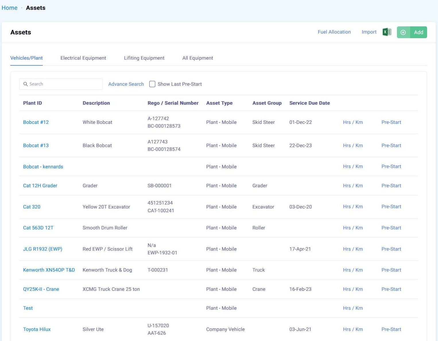 Adding Vehicles/Plant to the Asset list