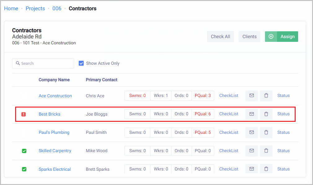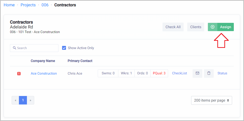 Home → Projects → Open Project → Contractors → Click Assign