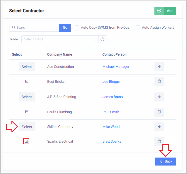 Click Select next to the Contractors/Sub-Contractors you wish to add to this project.