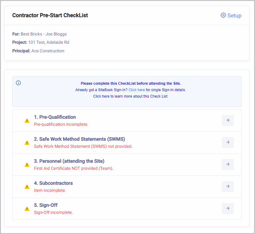 If you click on Checklist to see what the contractors are required to complete from their side.