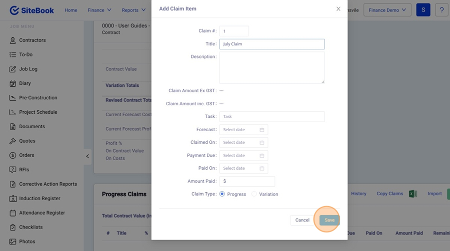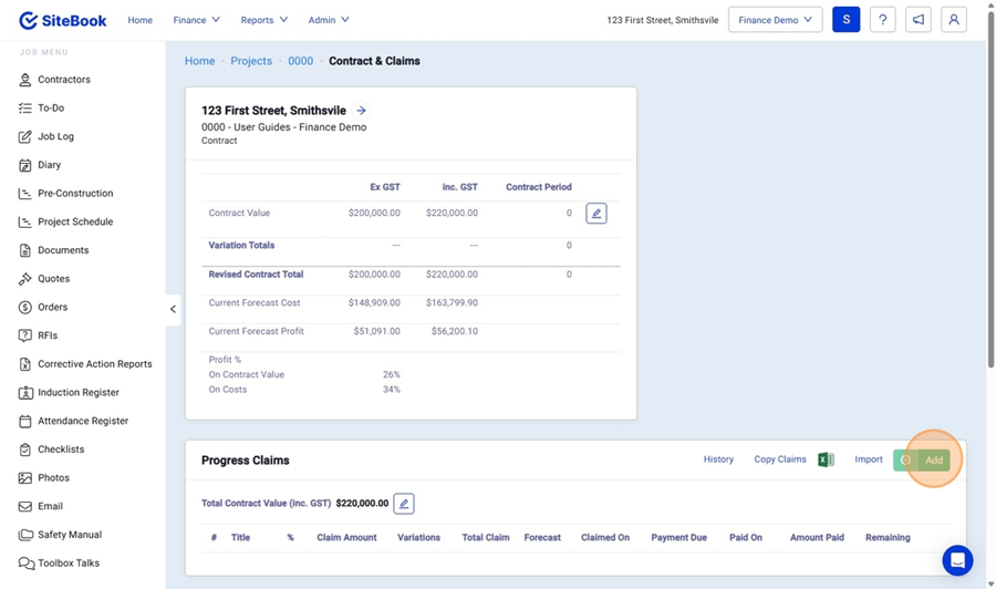7. Under Progress Claims click "Add"