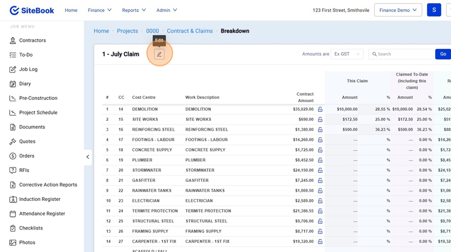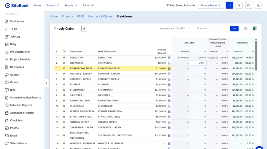 Client Claims: Work Complete by Cost Centre (% of Cost Centre Complete) | SiteBook Help Center