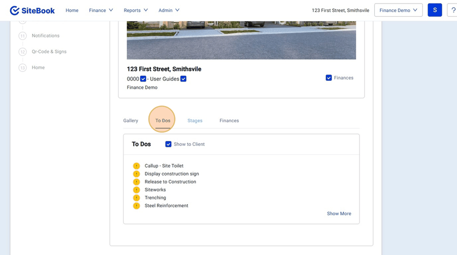 7. "To Dos" will show the current Task list for the Project in fine Detail.