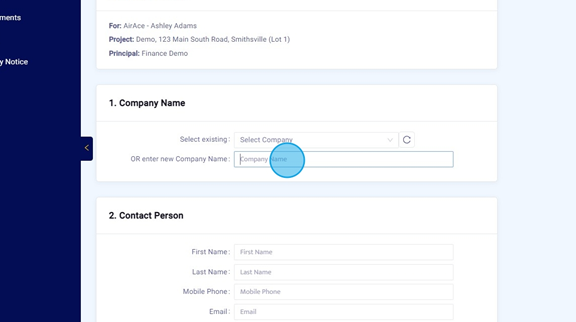 Click "OR enter new Company Name" field and enter the Subcontractors Company Name. Once a Subcontractor has been added to the system, they will appear in the "Select existing" drop down list.