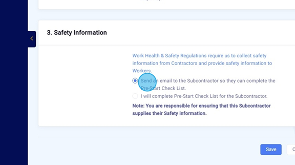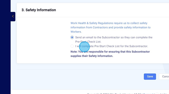 Alternatively, you can choose to complete the checklist on their behalf by choosing "I will complete Pre-Start Check List for the Subcontractor."