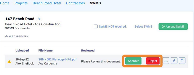 The "SWMS" option allows you to view SWMS uploaded by the contractor and "Approve" or "Reject" them.