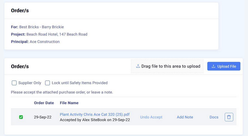 The "Ords" option allows you to view the status of any order(s) for the contract on the project as well as accept/decline them and manage any documents relevant to the order.