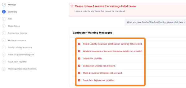 The "Status" option allows you to see an overview of the Contractor's details for the project as well as check for any outstanding issues, change the contractor's primary contact for the project and add notes or override any outstanding items.