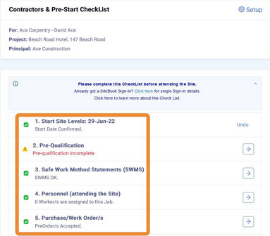 The "Checklist" option allows you to view any outstanding items for the Pre-Start safety checklist for the project.