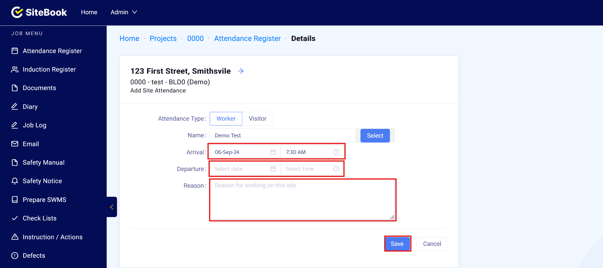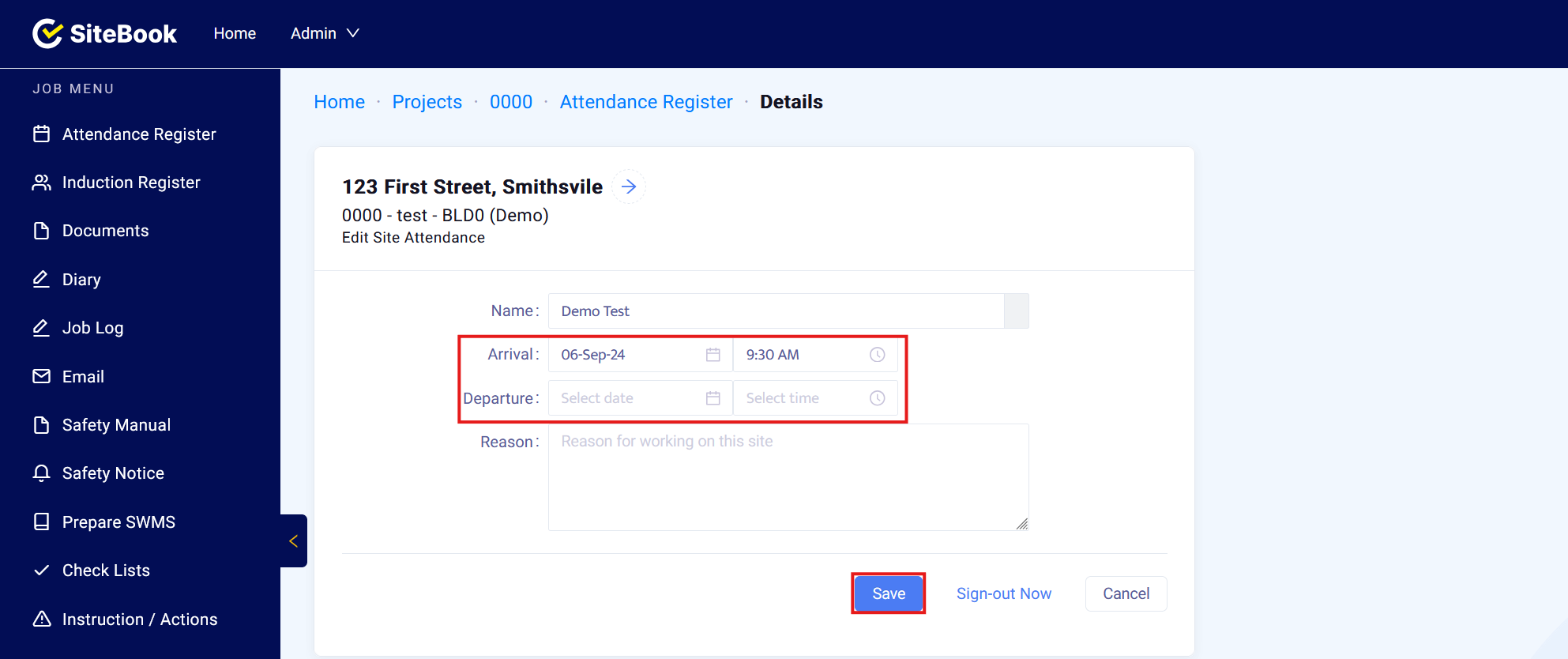 Enter the Date and Time of Arrival, set the Departure Date and Time (Optional) and enter the Reason for attending site (Optional) then save