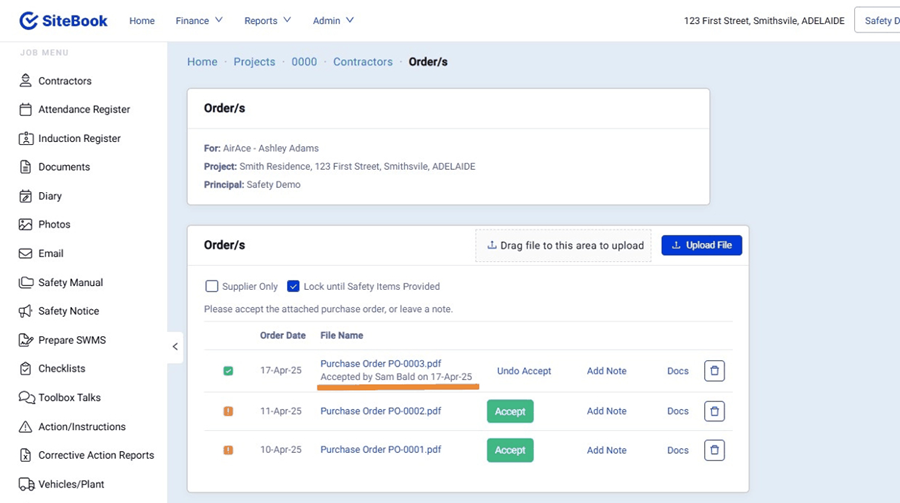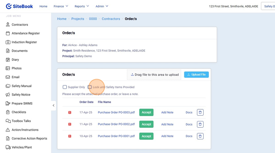 This will Prevent the Contractor from accessing the Purchase order until after they have provided you their safety information during the Pre-Start Checklist.