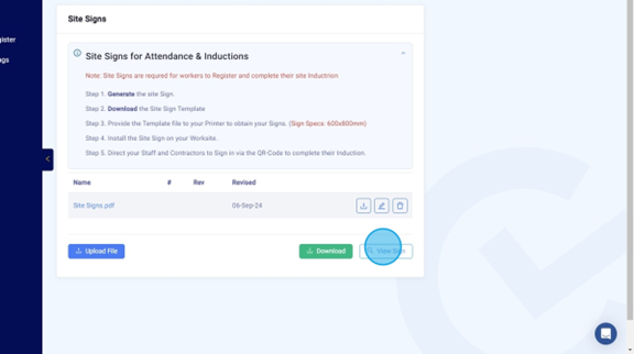 Generate and Download a Site Sign | SiteBook Help Center Generate and Download a Site SignGenerate and Download a Site Sign Updated over 7 months agoClick "Admin" Click "Site Signs" Click "Generate" Click "View Sign" Click "Download" Did this answer your question?😞😐😃