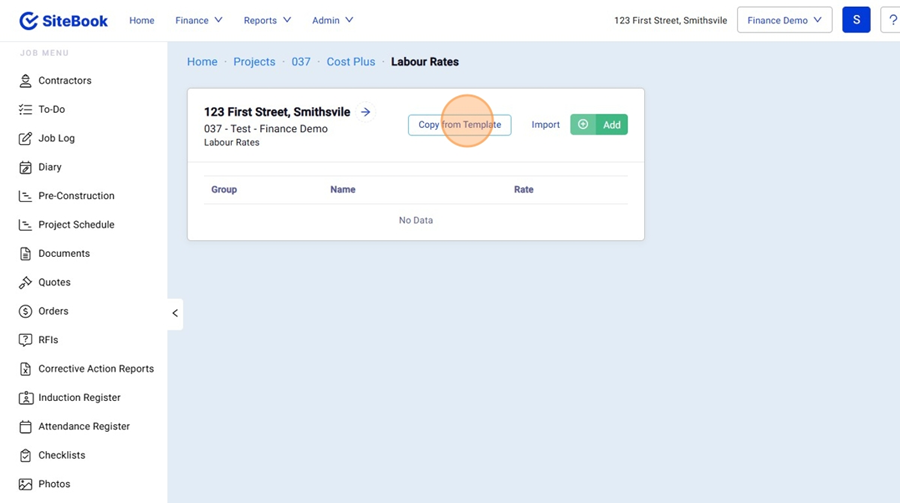 8. In the Project Specific Labour Rates Table, Click "Copy from Template"