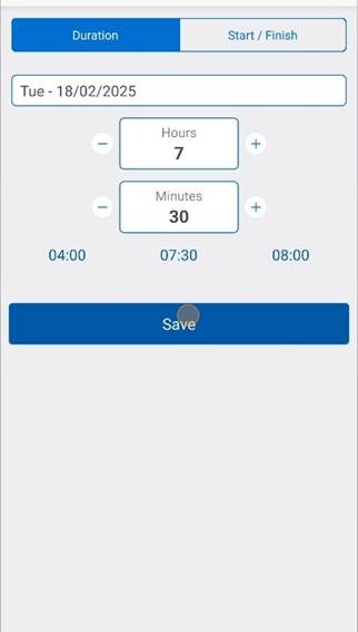 6. Hours for the Users can be added using Duration (Hours Only) or Start / Finish. (Time & Breaks)