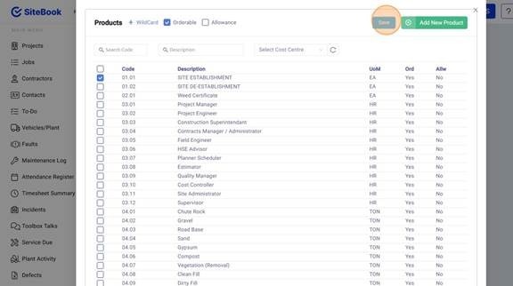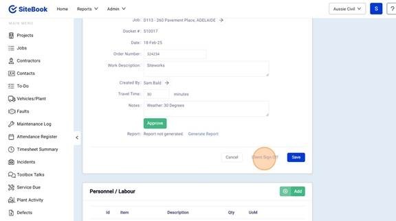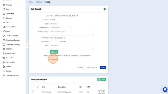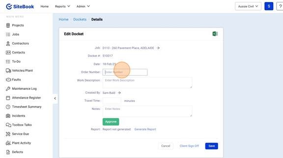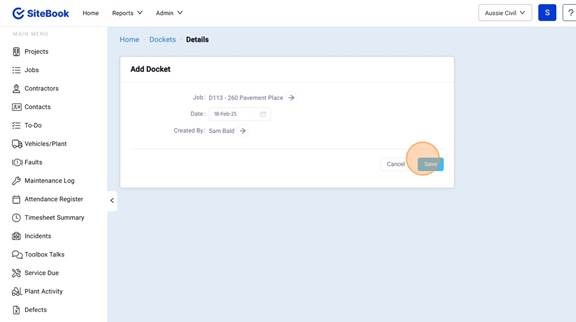 4. From the add Docket Screen, select the Job, Docket Date and Users name. Click save to create the Docket.