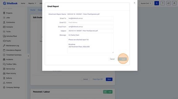 24. Edit the Recipients Details and click send to email the Docket Report.