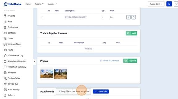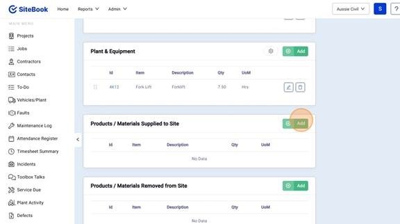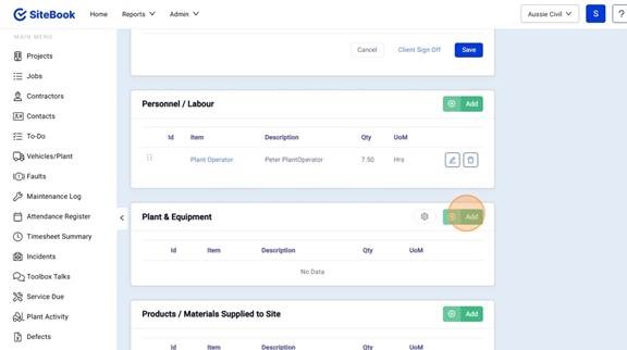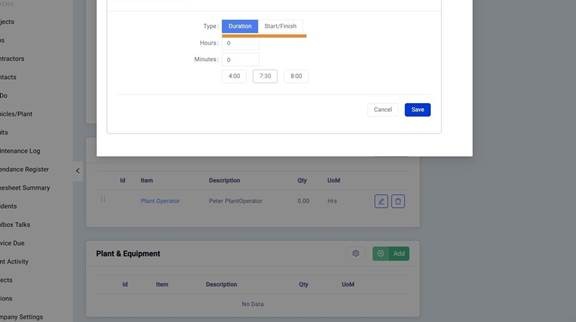 10. Hours for the Plant & Equipment can be added using Duration (Hours Only) or Start / Finish. (Time & Breaks)