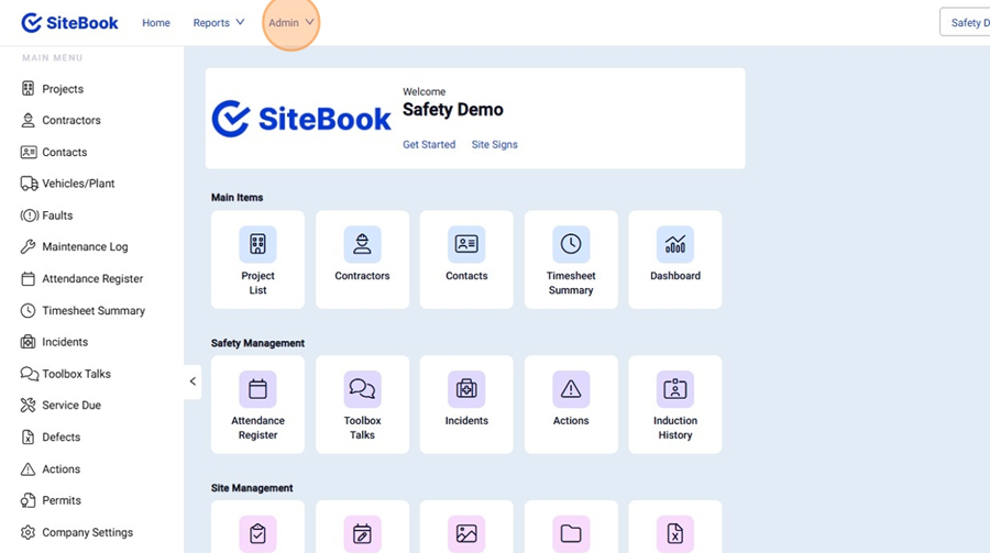 1. From the Homepage, Select the "Admin" Menu.