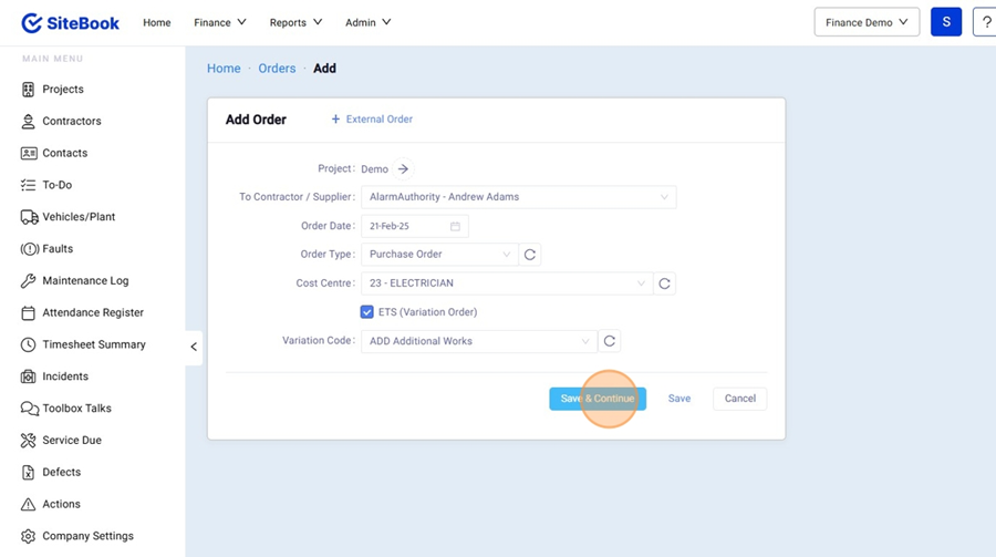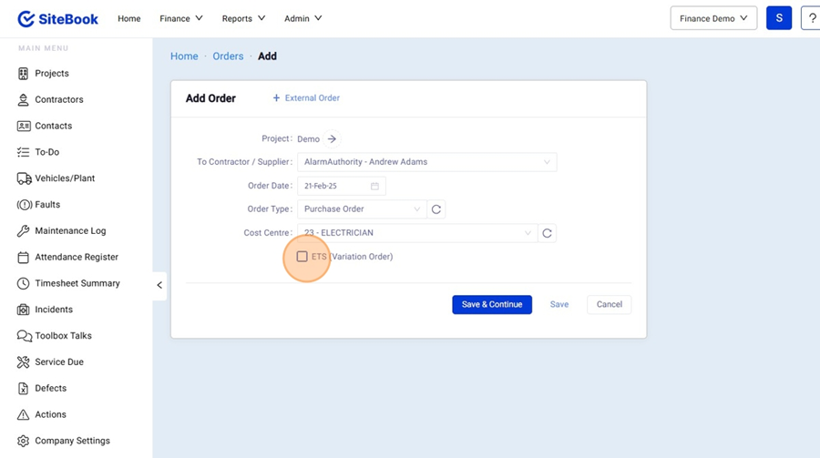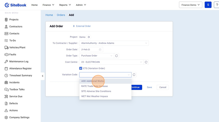 How to Create an ETS / Variation Order in SiteBook (WebApp)