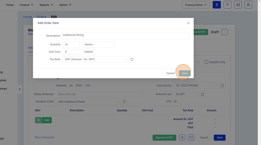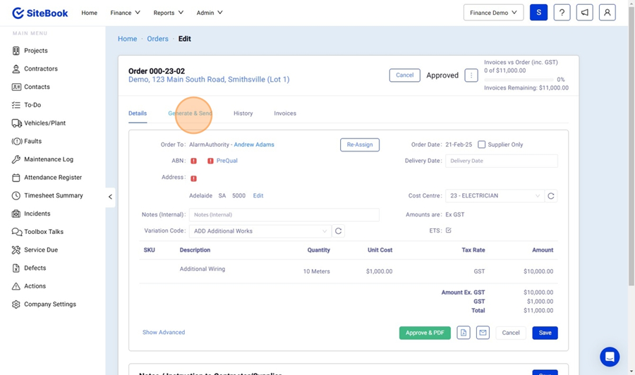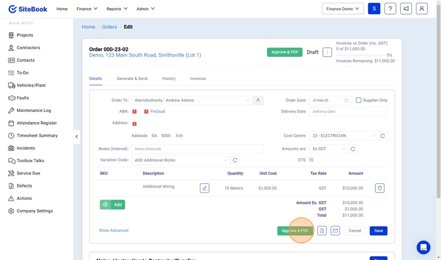 8. Click "Approve & PDF" (This will create the Order and it will be available in the Contractors Portal)