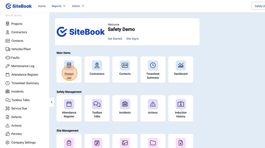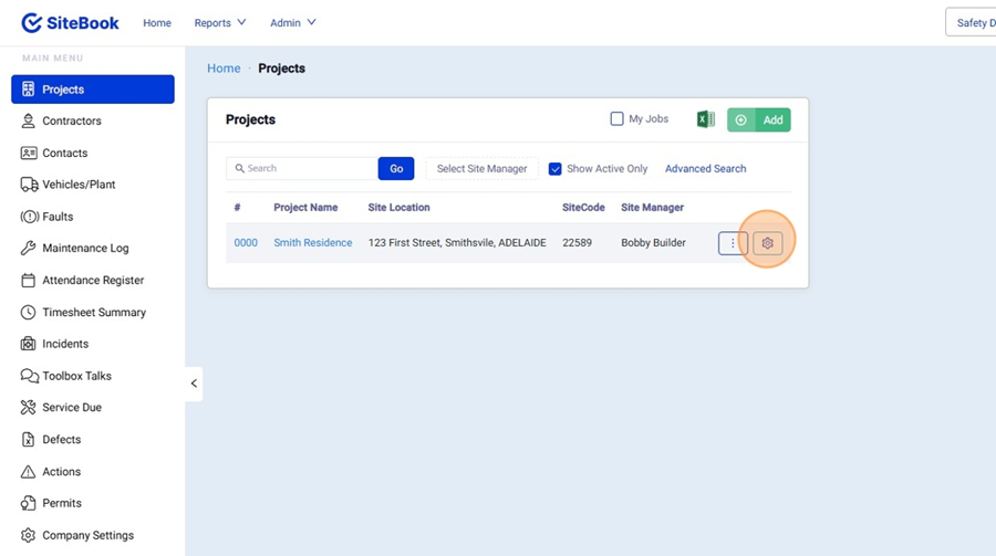 2. Find your Project in the list and select the "Gear icon" to open the "Project Setup" Menu.