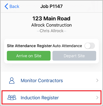 Select a Job's Induction Register