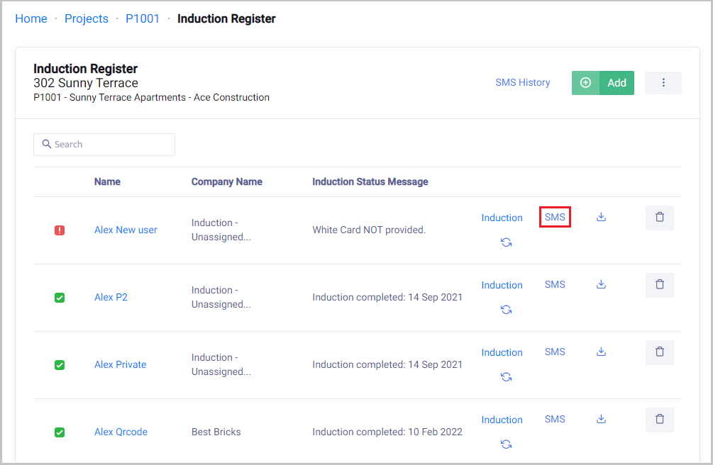 Click on SMS Next to send an Induction Request