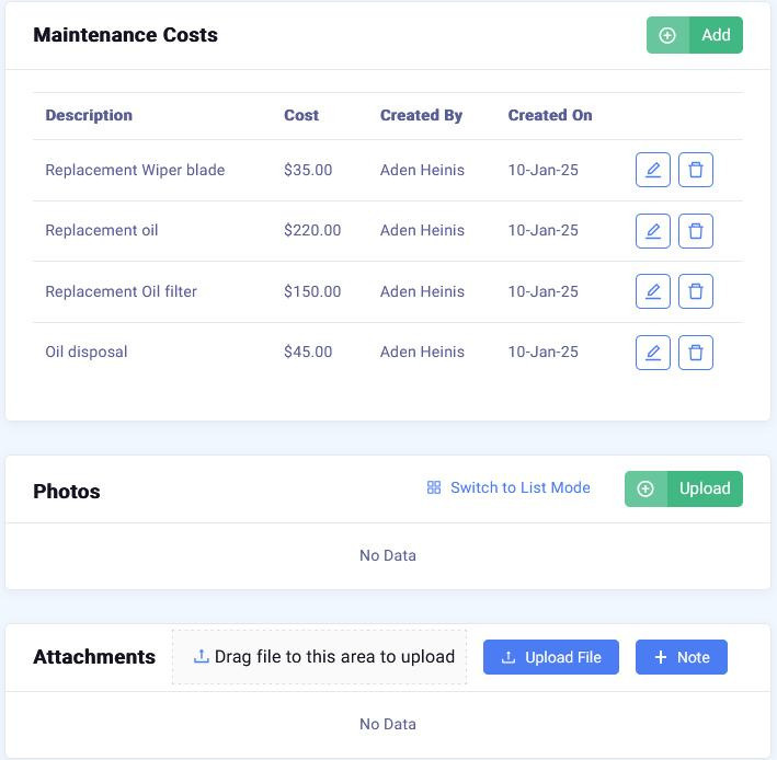 From here you can record costs associated with the maintenance, upload photos and attach documents such as invoices and receipts.