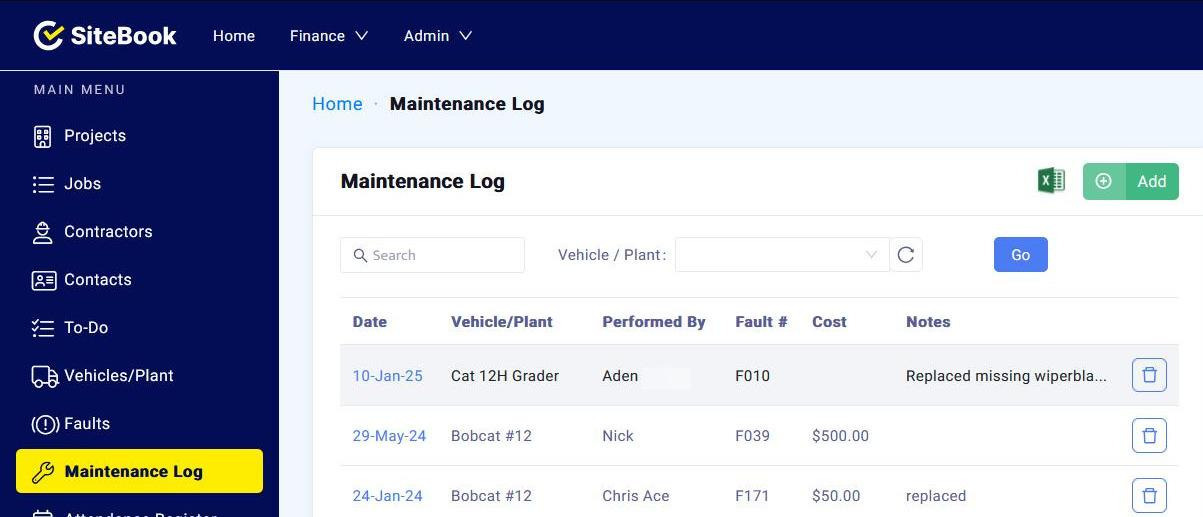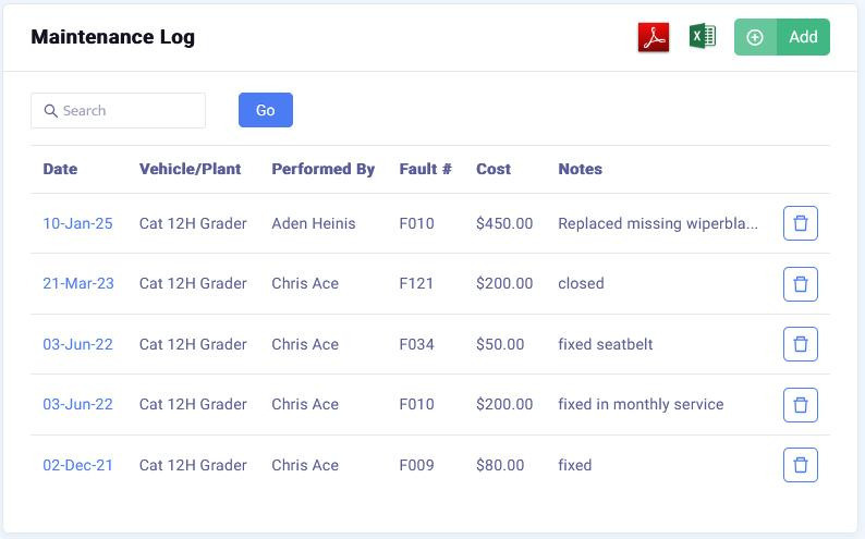 All maintenance entries for a vehicle/plant are recorded under the "Asset Details" section of the "Vehicle/Plant" menu where they can be exported as a PDF or Excel document.