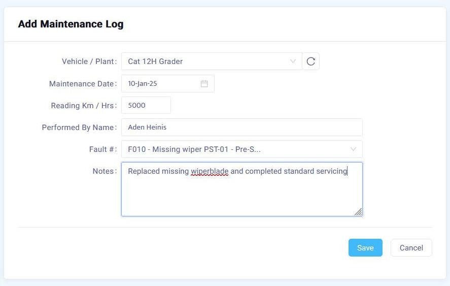 You can then select the vehicle or plant receiving maintenance, set the date, current odometer reading, who is completing the maintenance, set the fault being closed (if any) and leave notes about the maintenance.