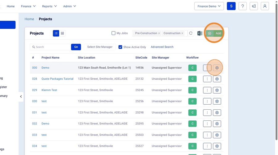 2. Select the Add Button to create a new Project or you can edit a project from the "Gear" Icon on the right hand side of the project in the list.