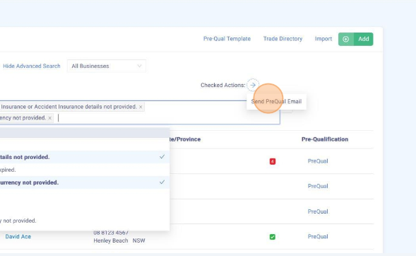 Mouse over the "Checked Actions" arrow and click "Send PreQual Email"