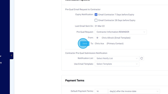 Scroll down to "Notification Options" Click "Send". This will send the Contractor a PreQual Email.