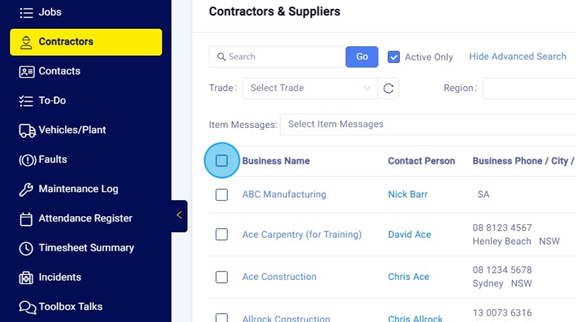 Click the top box to select all, or tick the required Contractors from the list.