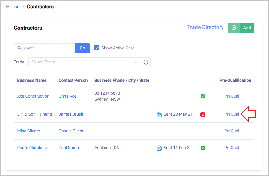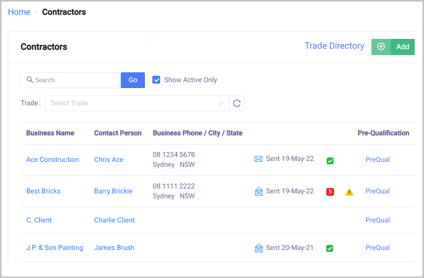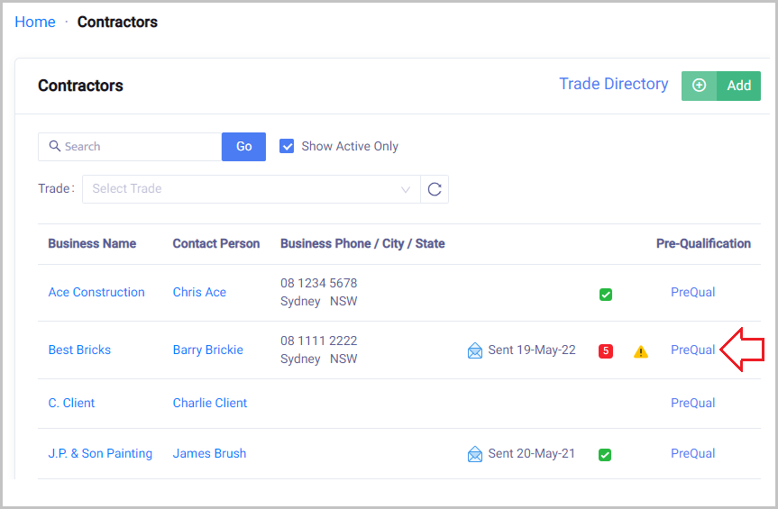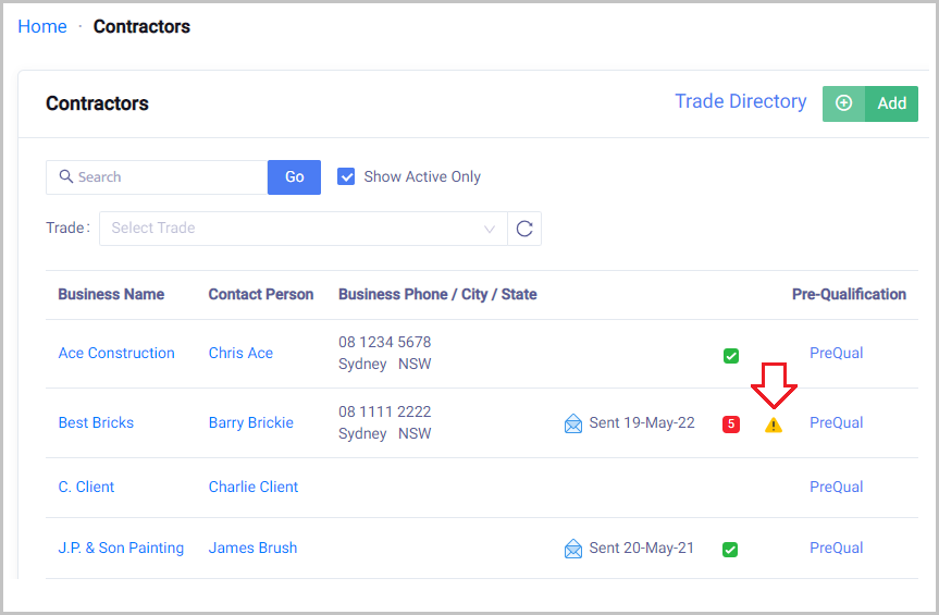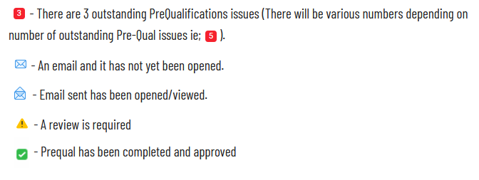 After a Contractor has supplied their information, a review request is automatically sent out. Contractors ready for review will have an icon signalling that a review is required.