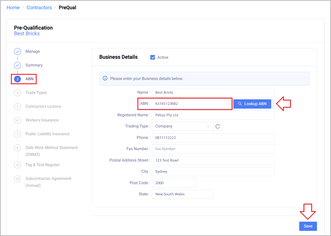By clicking on the blue "Lookup ABN" button the system will confirm the ABN number and autocomplete the Registered Name for the business.