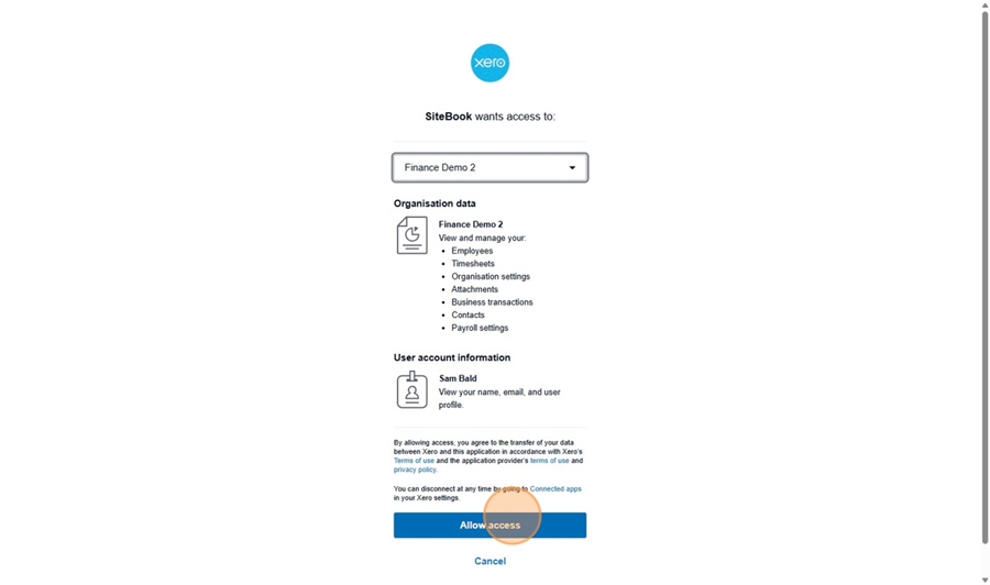 5. Click "Select an organisation" and choose your company from the list, then click "Allow access" to complete the log in process.