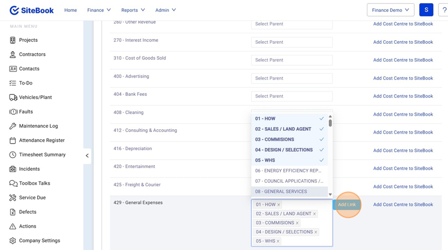 8. Select 1 (or more) SiteBook Cost Centres to Link and click the "Add Link" Button.