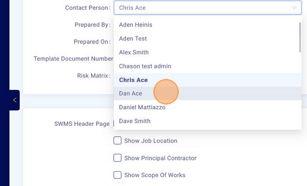 Updating Contact Person on SWMS | SiteBook Help Center Updating Contact Person on SWMSUpdating Contact Person on SWMS Updated over 7 months agoClick "Admin" Click " SWMS Templates " Select the SWMS you wish to update Click on the "Contact Person" drop down Select the new contact Click "Next " to save the changes Did this answer your question?😞😐😃