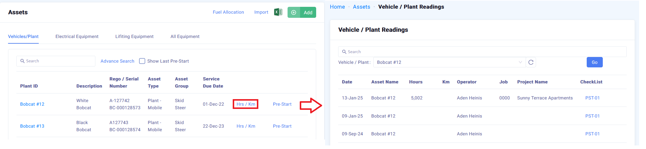 You can see a list of all Pre-Starts completed for an asset under the "Vehicle/Plant" menu by clicking on the "Hrs/Km" button.