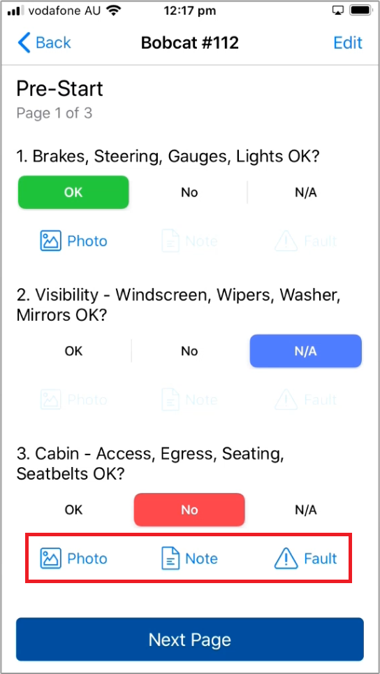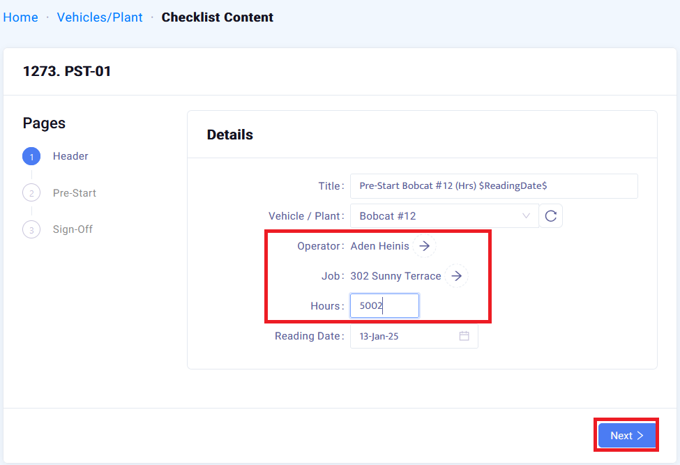 From here you can set the job to complete the pre-start against, select the operator and enter the Odometer reading and click "next" to progress with the pre-start