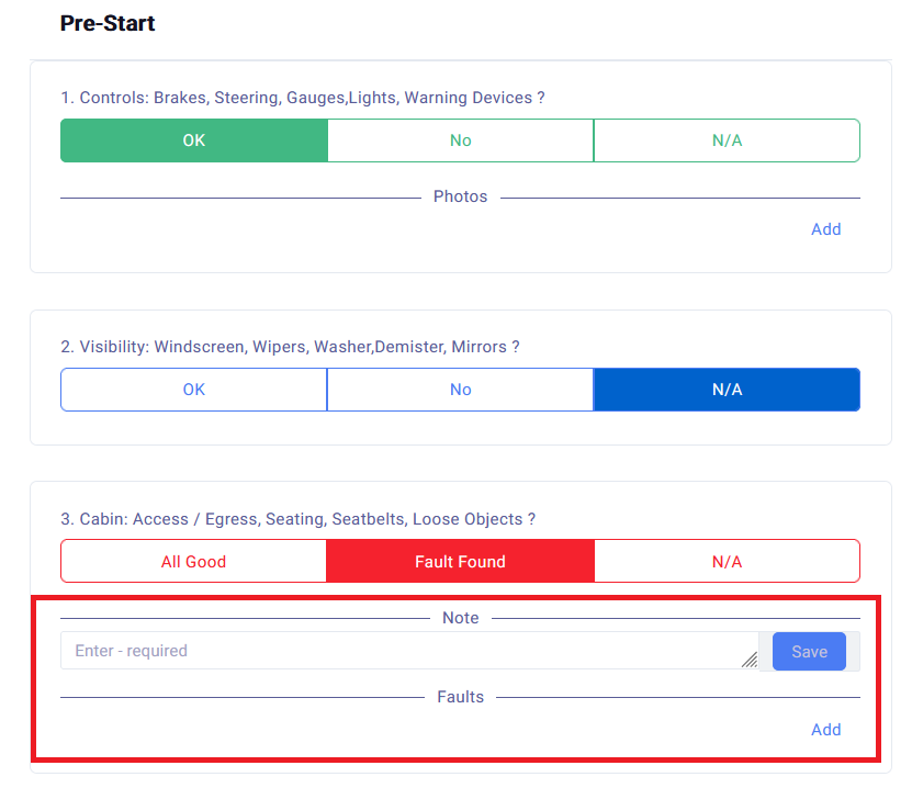 A Fail Answer will let you add a Note or a Fault. The Checklist Template can be configured to require a Fault or Note on a Fail Answer.