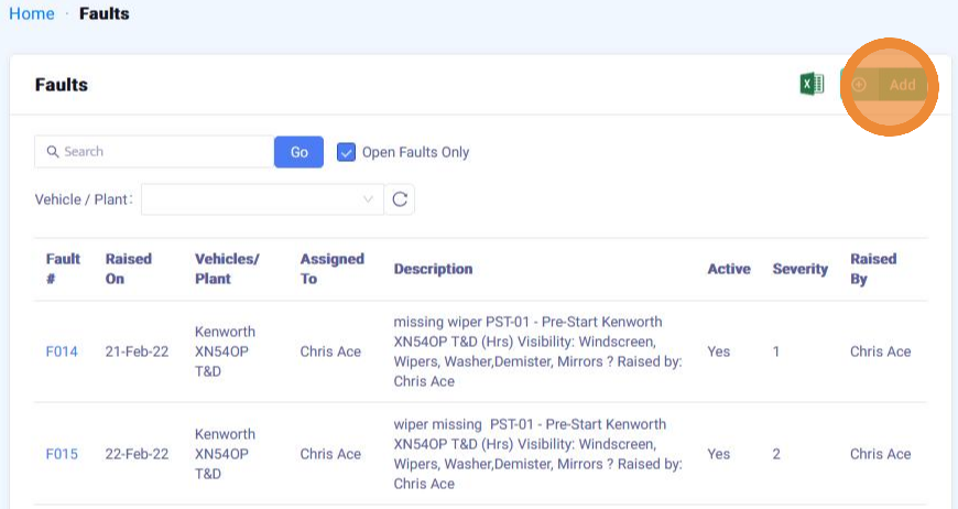 The first way to raise a fault is via the "Faults" menu, using the "Add" button. The second way is manually via a Pre-Start checklist, for more information on this please view the "Pre-Start Checklist Guide".