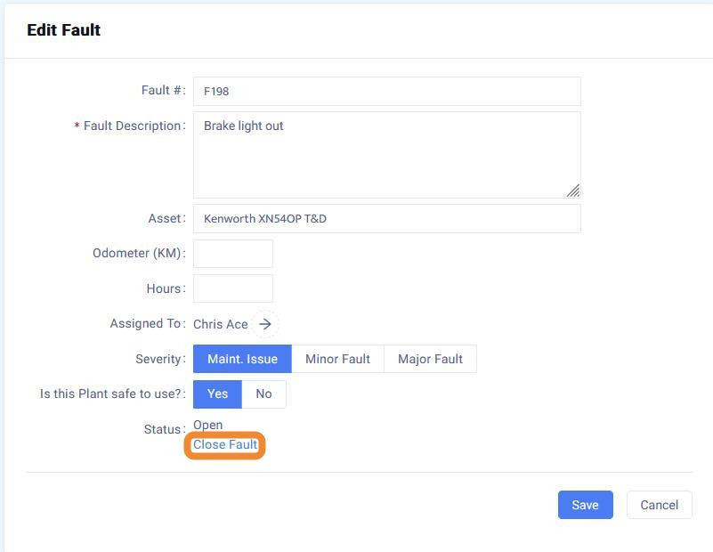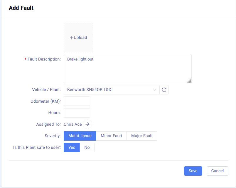 When raising a fault, a fault description must be entered, an asset must be selected and an Odometer reading and photos can be added. In addition to this, a fault can be assigned to a contact, a severity selected and the plant can be marked as safe/unsafe to use.